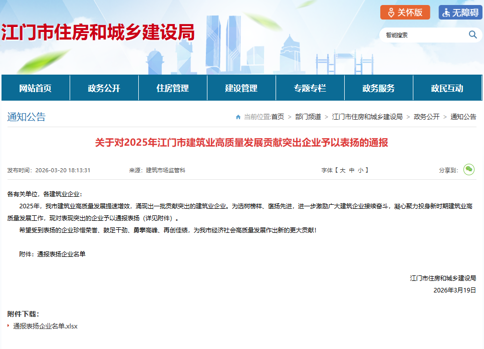 | 发文编号: | 关于对2025年江门市建筑业高质量发展贡献突出企业予以表扬的通报 |
