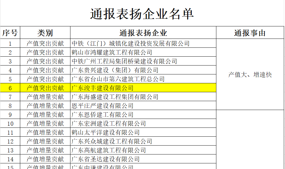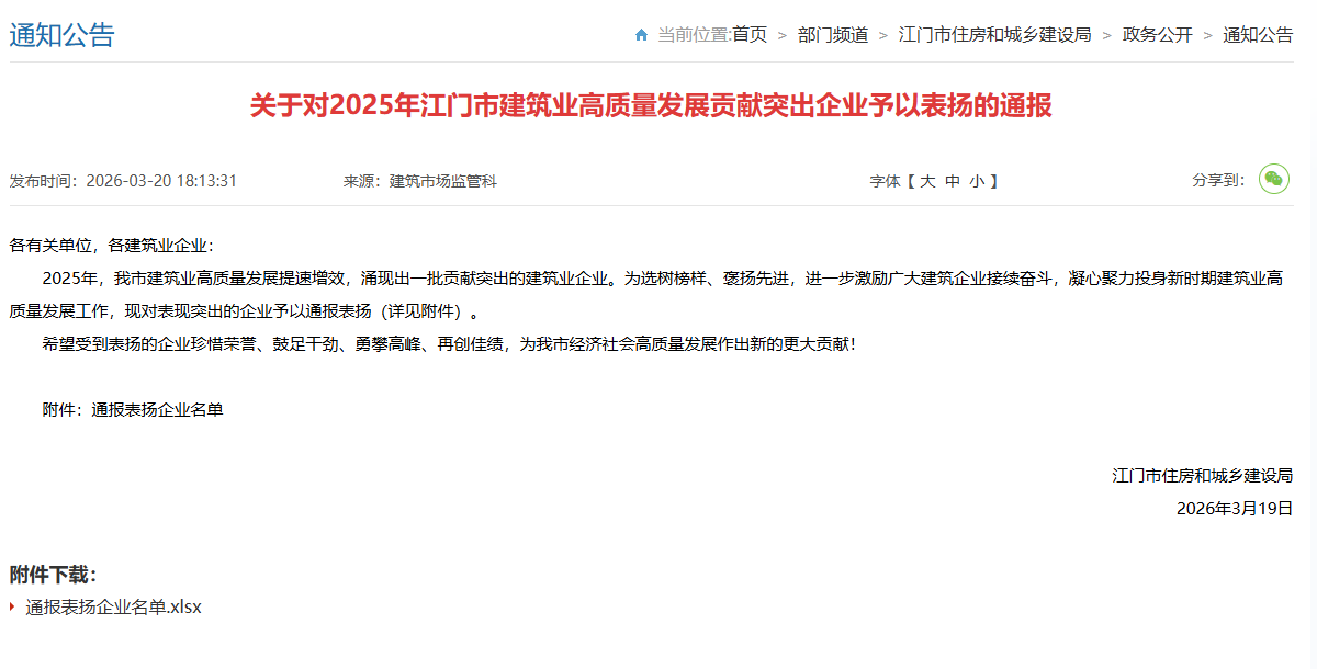 | 发文编号: | 关于对2025年江门市建筑业高质量发展贡献突出企业予以表扬的通报 |