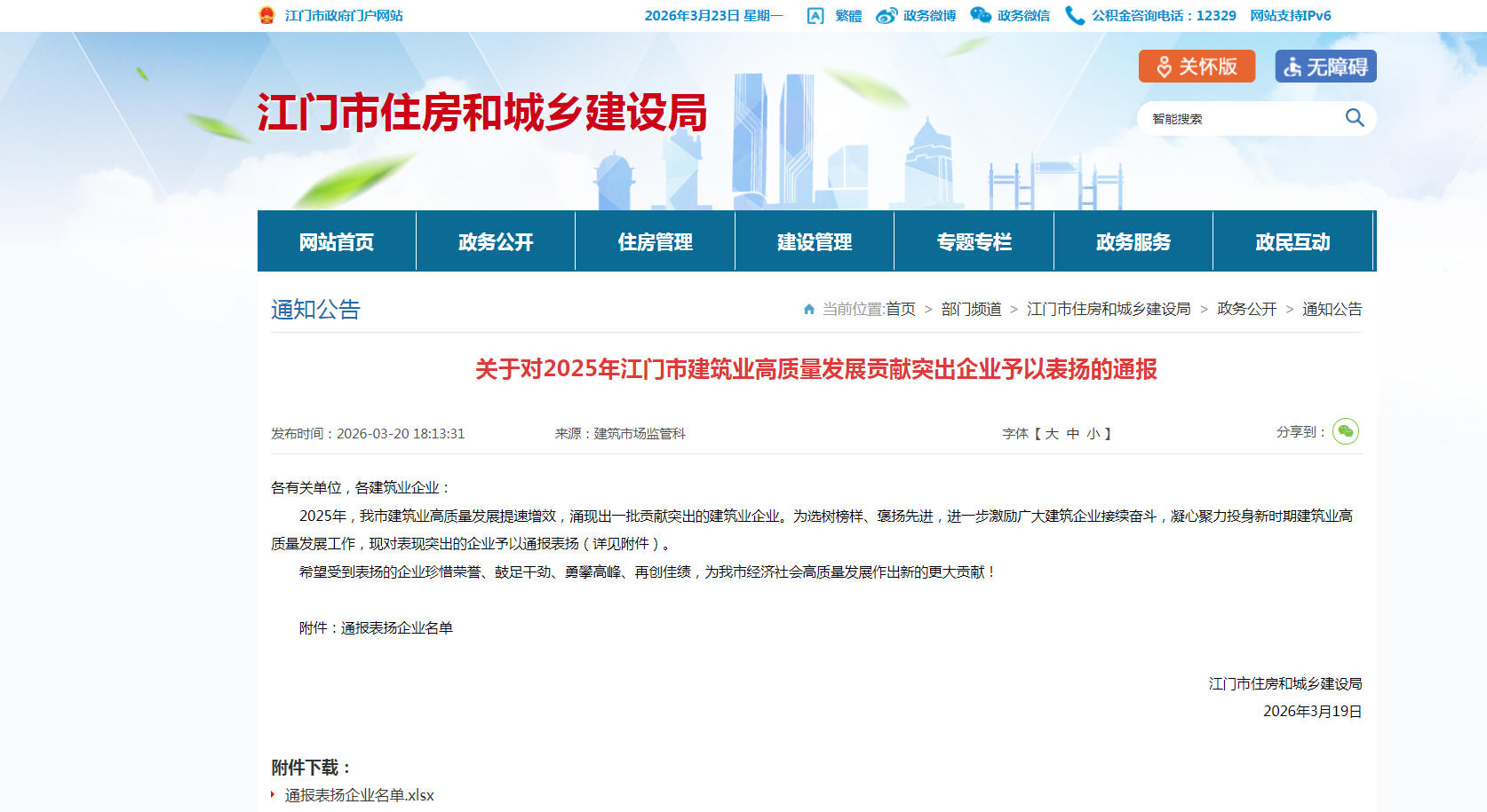 | 类别名称: | 市级住房城乡建设主管部门:与房屋市政工程建设有关市场行为、质量安全以及与市建筑业高质量发展相关方面的通报表扬 |
