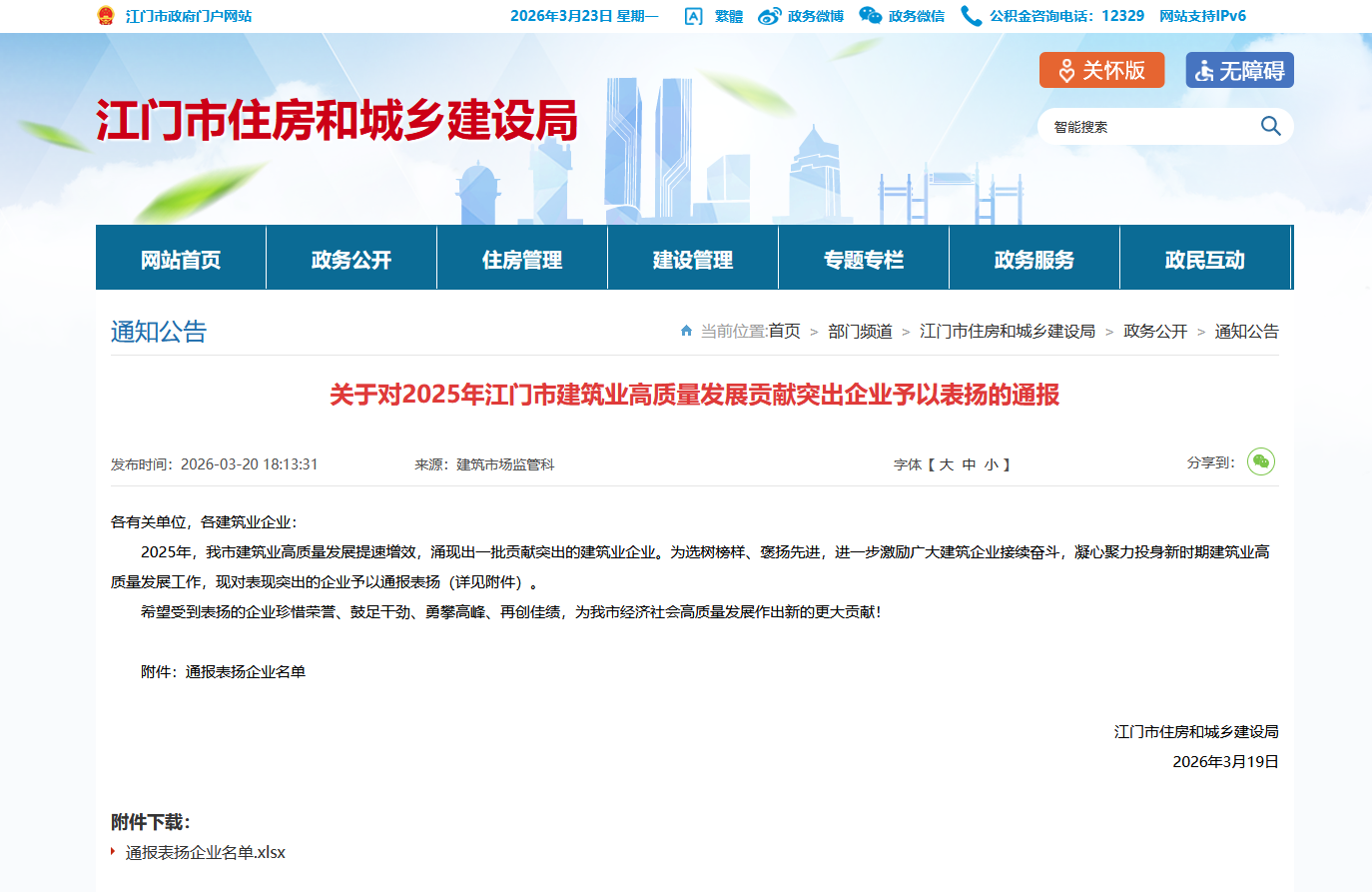 | 类别名称: | 市级住房城乡建设主管部门:与房屋市政工程建设有关市场行为、质量安全以及与市建筑业高质量发展相关方面的通报表扬 |