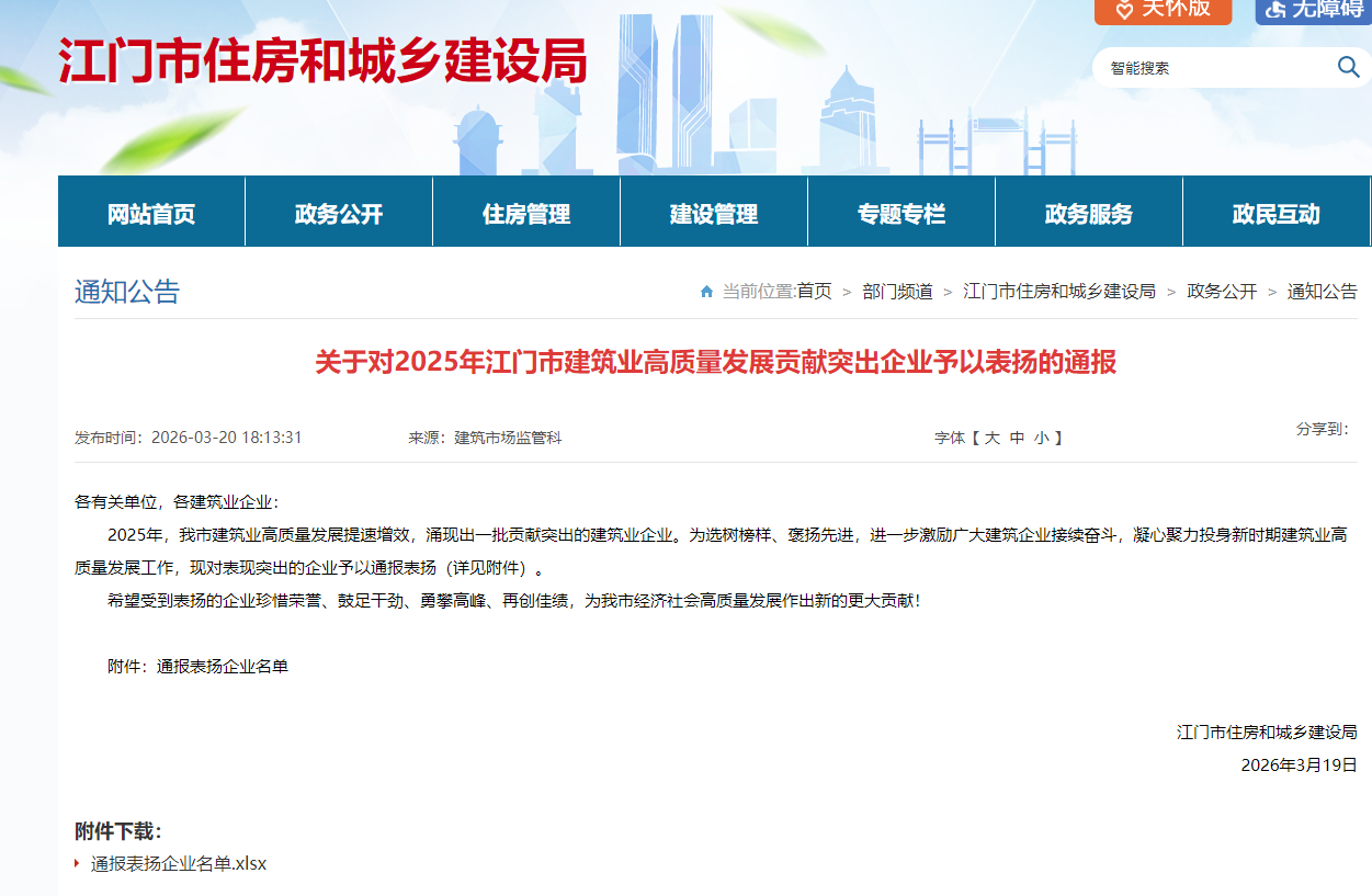 | 类别名称: | 市级住房城乡建设主管部门:与房屋市政工程建设有关市场行为、质量安全以及与市建筑业高质量发展相关方面的通报表扬 |