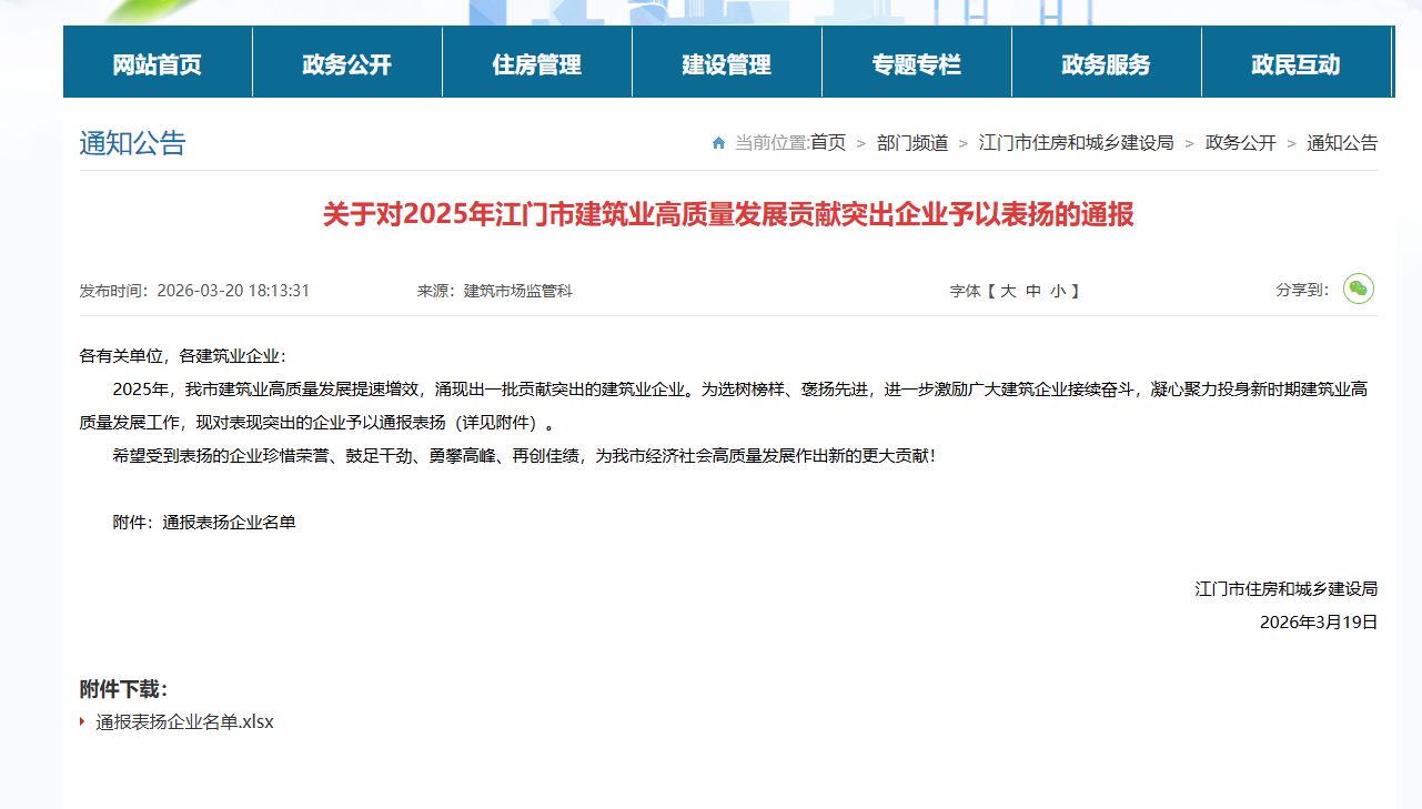 | 类别名称: | 市级住房城乡建设主管部门:与房屋市政工程建设有关市场行为、质量安全以及与市建筑业高质量发展相关方面的通报表扬 |