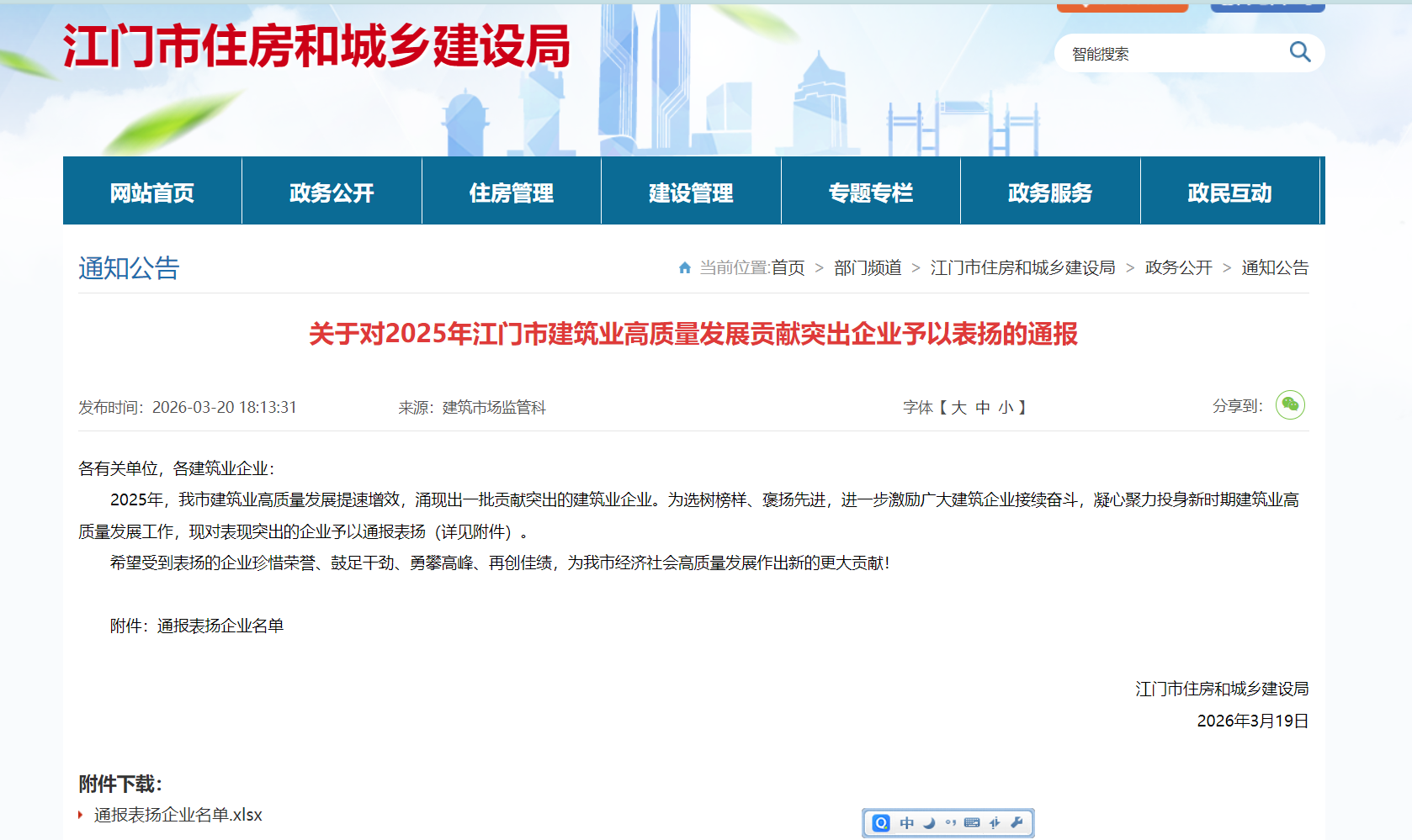 | 类别名称: | 市级住房城乡建设主管部门:与房屋市政工程建设有关市场行为、质量安全以及与市建筑业高质量发展相关方面的通报表扬 |
