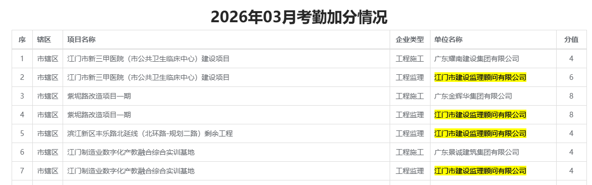 | 类别名称: | 60%≤人员月在岗率、人员月在岗时长<75%,对纳入实名制管理的房屋市政项目,总监理工程师和专业监理工程师在一个月内均达到以下在岗率,企业可申请加分,上限150分。(最后计算结果四舍五入并精确到0.01)。人员月在岗率:当月在岗天数/当月应在岗天数,总监月在岗时长:当月在岗累计时长/当月工作日天数×2.5,专监月在岗时长:当月在岗累计时长/当月工作日天数×8。 |