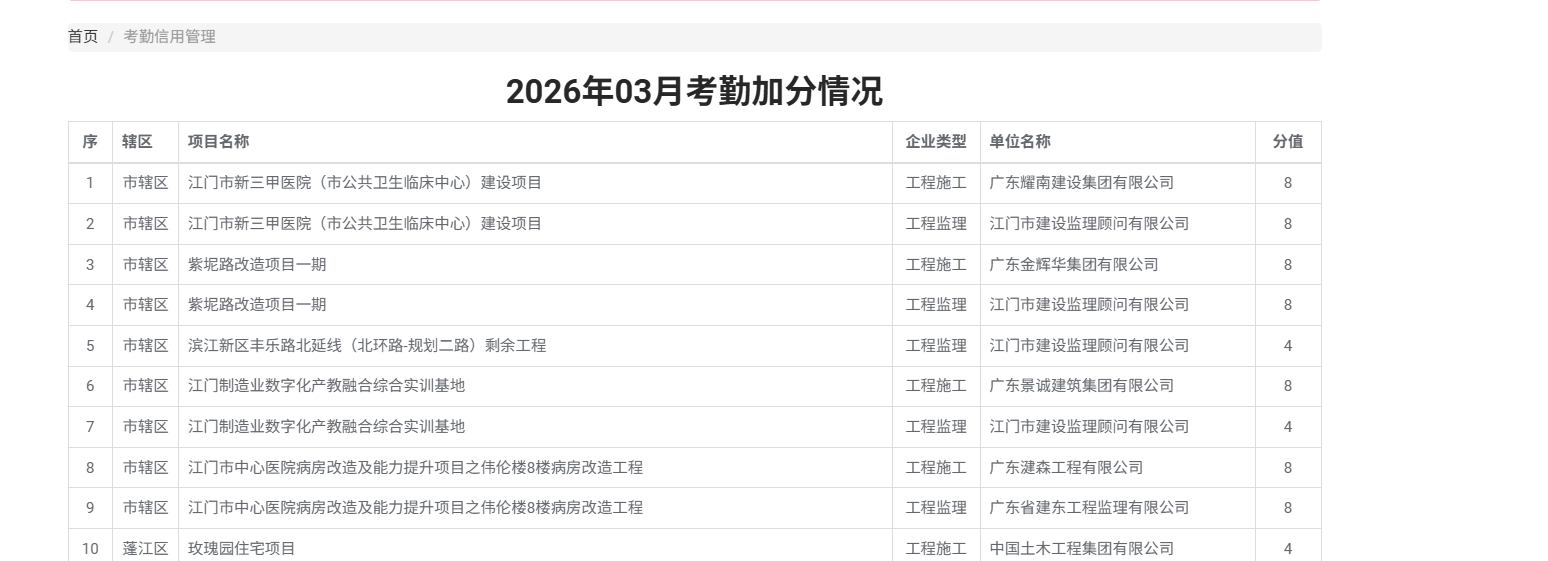| 类别名称: | 75%≤人员月在岗率、人员月在岗时长<90%,对纳入实名制管理的房屋市政项目,总监理工程师和专业监理工程师在一个月内均达到以下在岗率,企业可申请加分,上限150分。(最后计算结果四舍五入并精确到0.01)。人员月在岗率:当月在岗天数/当月应在岗天数,总监月在岗时长:当月在岗累计时长/当月工作日天数×2.5,专监月在岗时长:当月在岗累计时长/当月工作日天数×8。 |